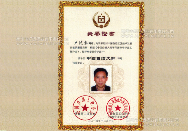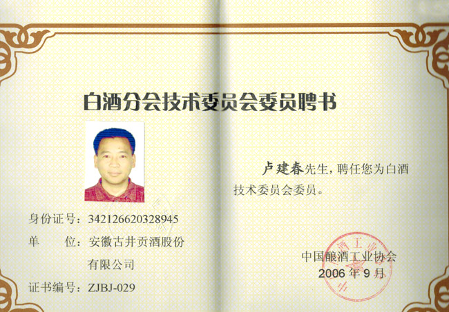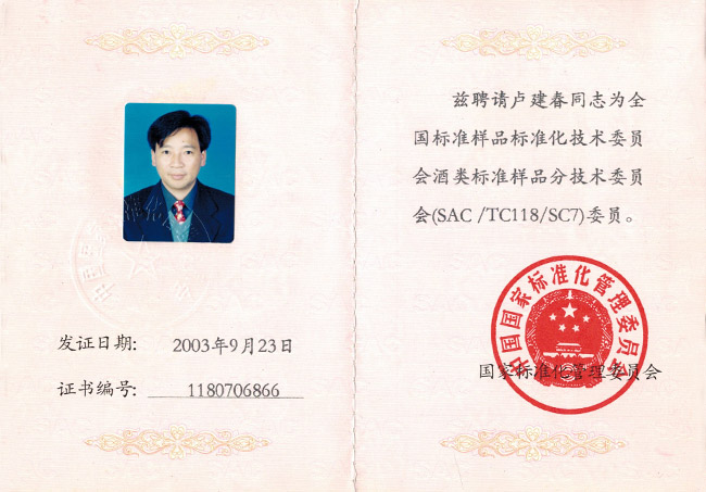 中國(guó)白酒國(guó)家評(píng)委證書(shū)