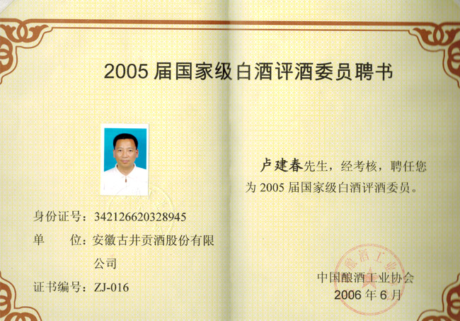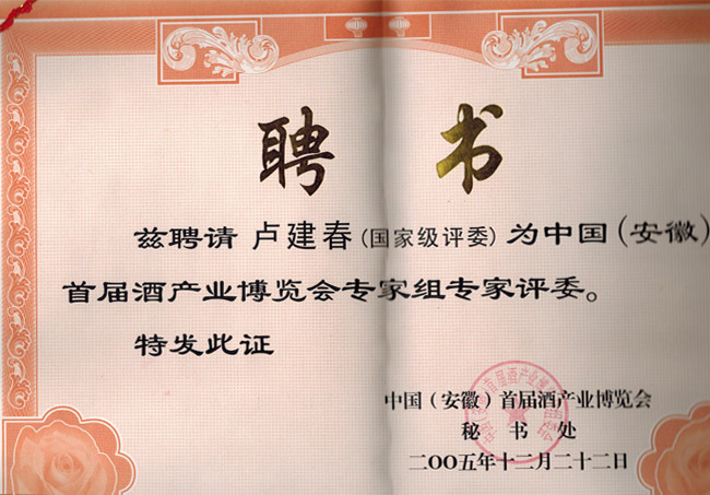 2005屆國(guó)家級(jí)白酒評(píng)酒委員聘書(shū)